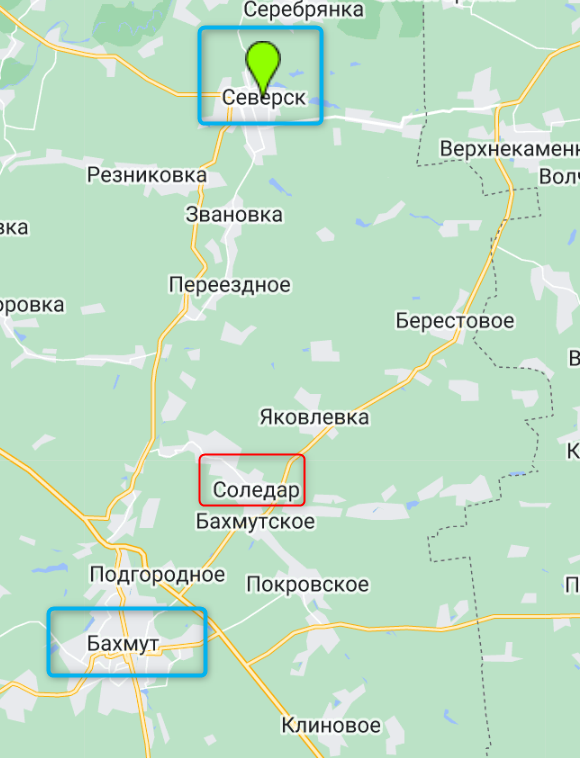 В последние дни информация о боях в районе Северска стала поступать чаще. После продвижения российских войск в Соледаре, у них появилась возможность атаковать город не только с востока, но и с юга. Российские телеграм-каналы пишут, что уже перерезана трасса из Северска в Бахмут около станции Соль.