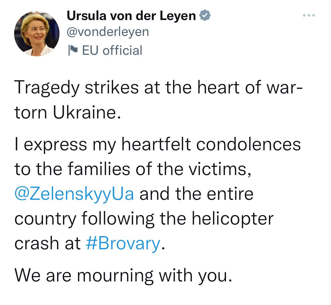 "Трагедия поразила сердце истерзанной войной Украины. Выражаю искренние соболезнования семьям погибших и всей стране после крушения вертолета в Броварах. Мы скорбим вместе с вами", - написала Урсула фон дер Ляйен.