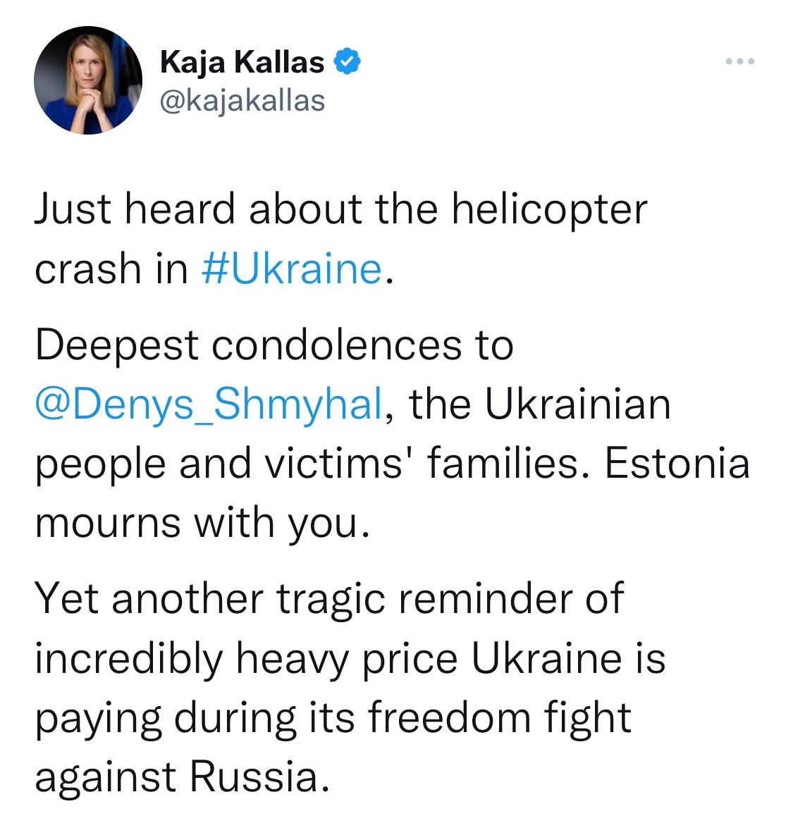 "Только что услышала о крушении вертолета в Украине. Глубочайшие соболезнования украинскому народу и семьям погибших. Эстония скорбит вместе с вами.