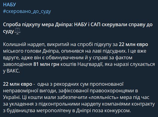 По версии следствия, в сентябре 2022 года Микитась предложил мэру Днепра "неправомерную выгоду" за заключение с подконтрольными ему компаниями и Европейского банка реконструкции и развития (ЕБРР), который осуществляет финансирование проекта, прямого контракта на строительство метрополитена в Днепре вне конкурса.