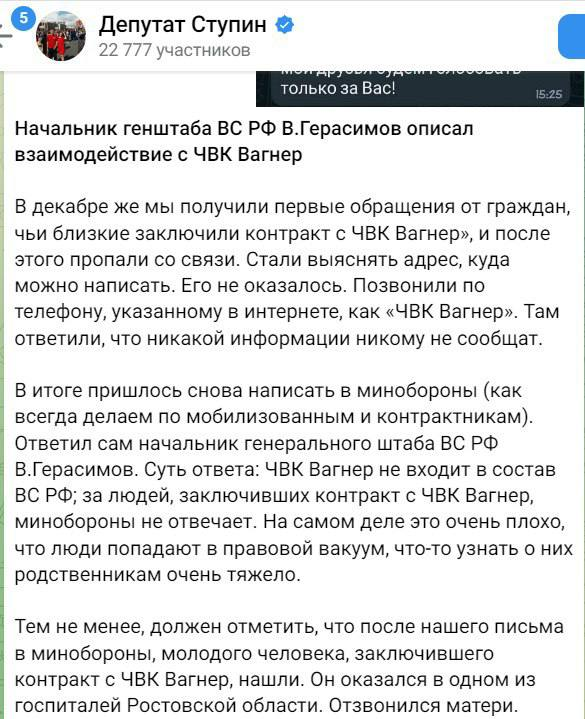 В декабре 2022 года депутат Московской городской думы Евгений Ступин обратился в Минобороны с запросом относительно граждан, которые заключили контракт с ЧВК "Вагнер" и после этого пропали со связи.