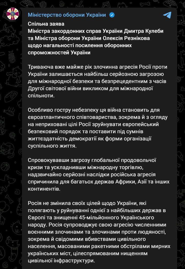 10:52 Министры Резников и Кулеба обратились к западным партнерам с призывом предоставить Украине танки.