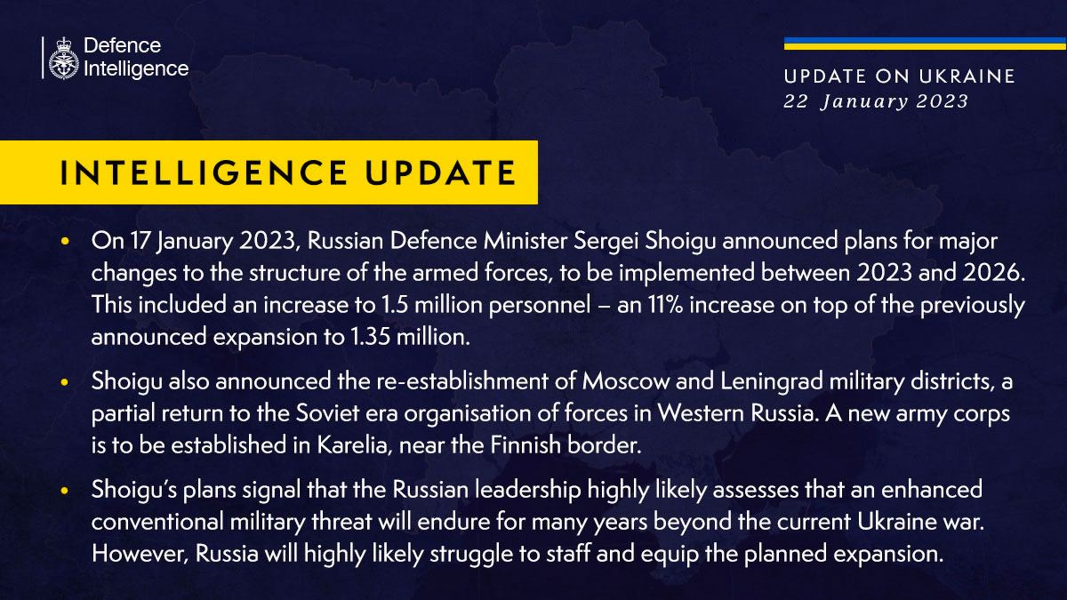 "Планы Шойгу сигнализируют о том, что российское руководство, скорее всего, считает, что усиленная военная угроза с применением обычных вооружений сохранится еще много лет после нынешней войны в Украине. Однако России, скорее всего, будет трудно укомплектовать персонал и оснастить запланированное расширение", - отмечает разведка Британии.