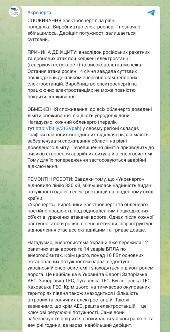 "До всех облэнерго доведены лимиты потребления, действующие в течение суток. Превышение лимитов приводит к риску создания аварийных ситуаций в энергосистеме. Поэтому для их предупреждения используются аварийные отключения", - говорится в сообщении компании.
