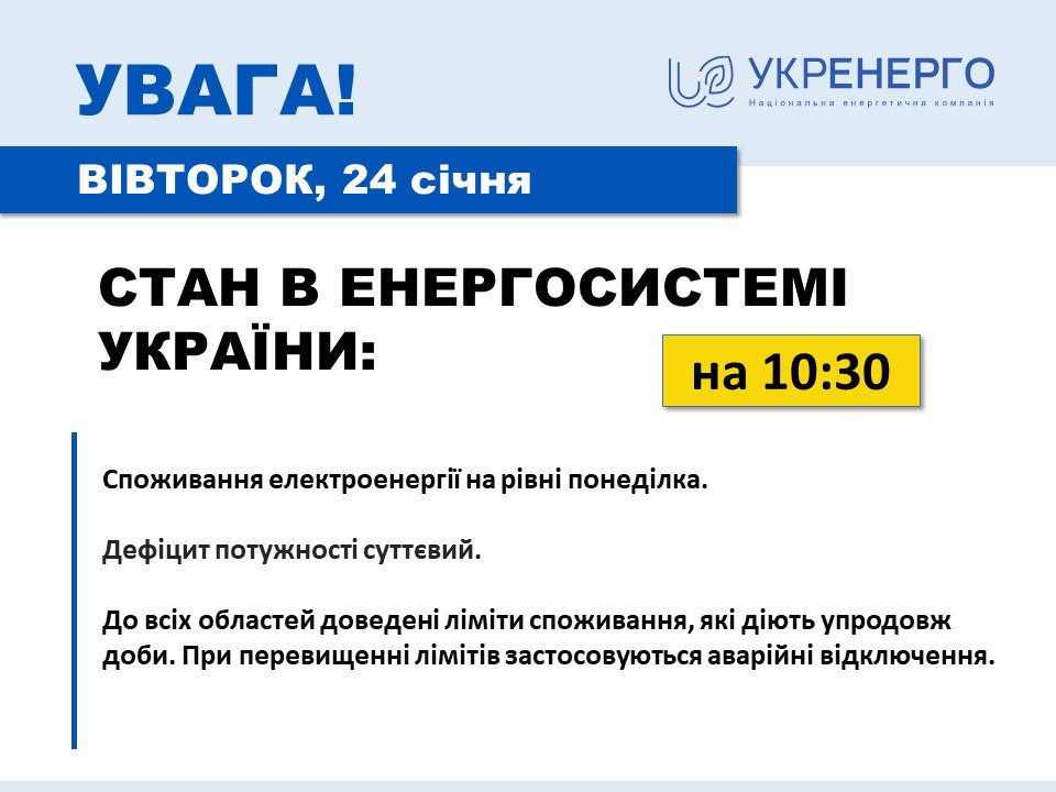 Во вторник, 24 января, в Украине потребление электроэнергии остается на уровне понедельника. Производство электроэнергии незначительно увеличилось, однако дефицит мощности остается существенным.