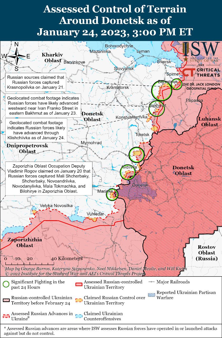Также Институт отмечает, что российские силы продолжали наносить наземные удары в районе Бахмута, но при этом добились незначительных территориальных успехов.
