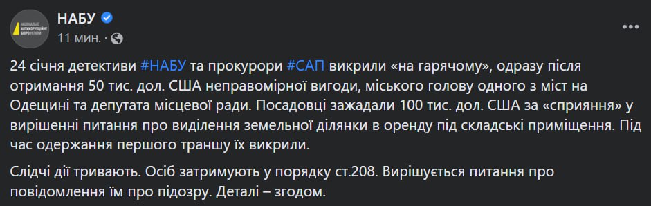 10.45 НАБУ и САП задержали "на горячем" на взятке в 50 тысяч долларов мэра одного из городов в Одесской области и депутата местного совета.