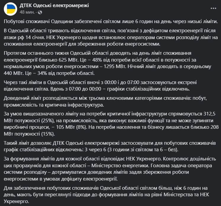 В ДТЭК Одесские электросети сообщили, что при существующих графиках на нужды на населения и бизнеса остается 15% мощностей (для критической инфраструктуры - 25% мощности, на промышленность – 8% из 48% потребностей, которые покрываются лимитами)