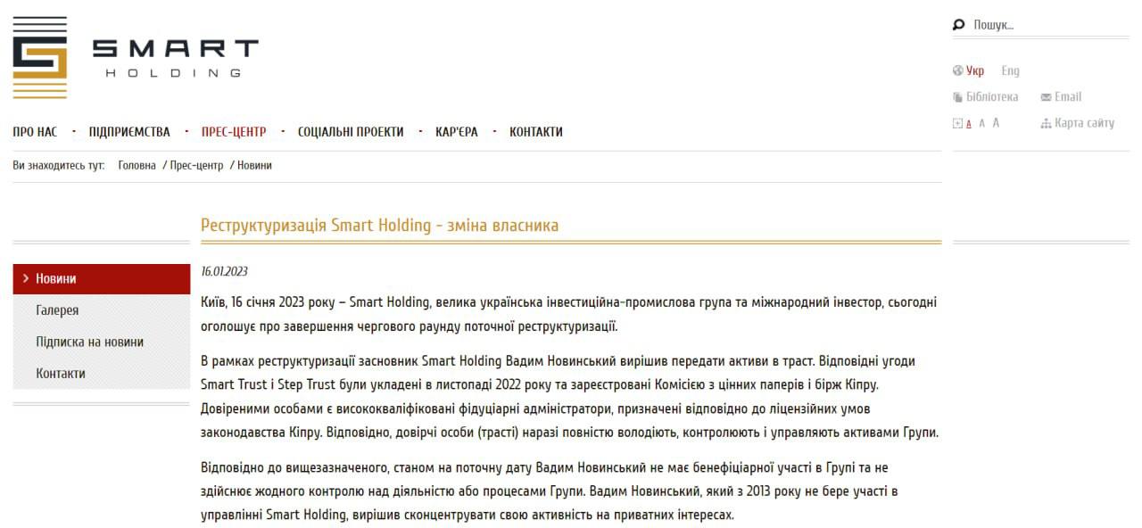 Там сообщают, что "по состоянию на текущую дату Вадим Новинский не имеет бенефициарного участия в Группе и не осуществляет никакого контроля над деятельностью или процессами Группы".