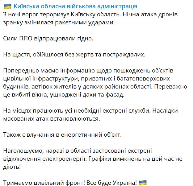 Во время атаки россиян по Киевской области было попадание в энергетический объект. Также пострадали частные и многоэтажные дома, машины жителей.