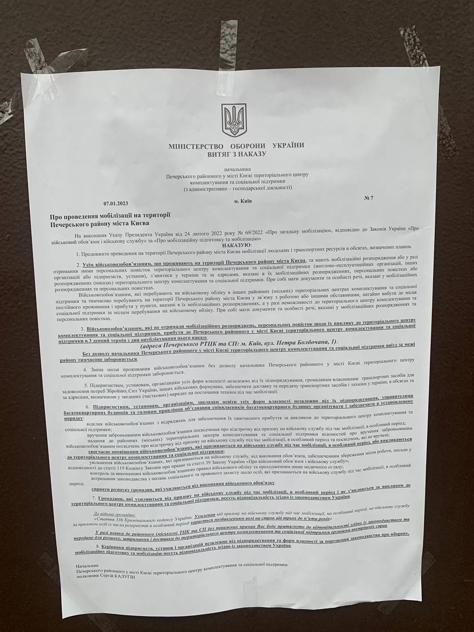 11.02 Объявления с призывом ко всем явиться в военкомат без повестки в трехдневный срок появились и в Печерском районе Киева.