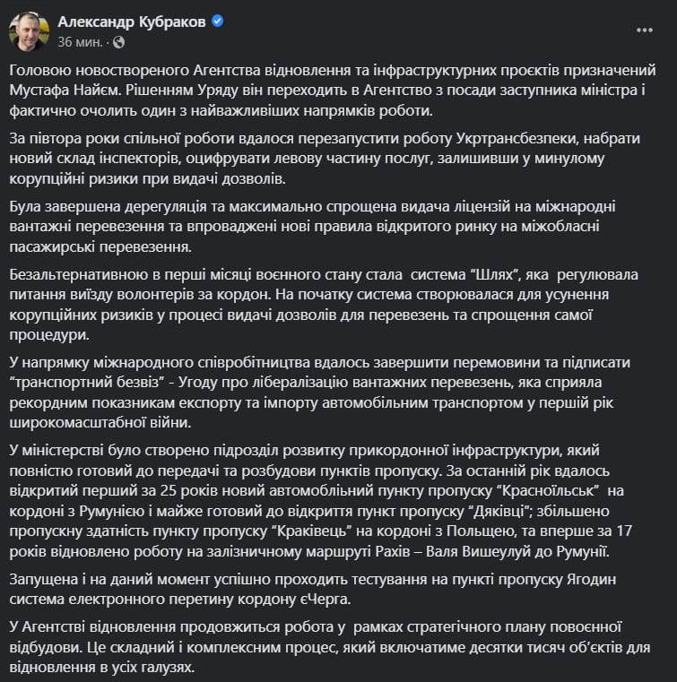 "Ключевые задачи, поставленные перед руководителем Агентства: запустить фактическую работу с первыми объектами восстановления, отработать механизм взаимодействия с донорами – правительствами стран, международными финансовыми институтами, неправительственными организациями, скоординировать запросы от регионов относительно приоритетных проектов восстановления", - написал Кубраков.