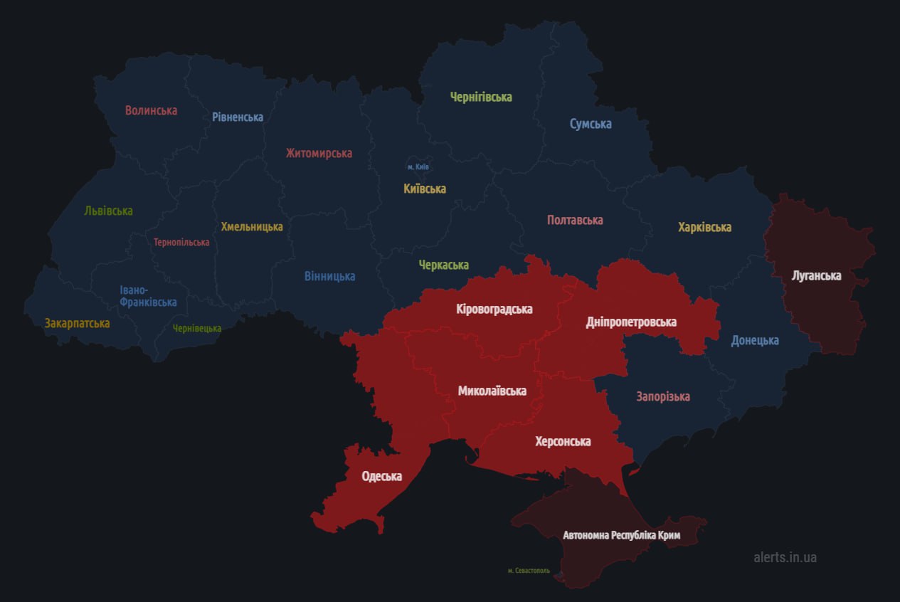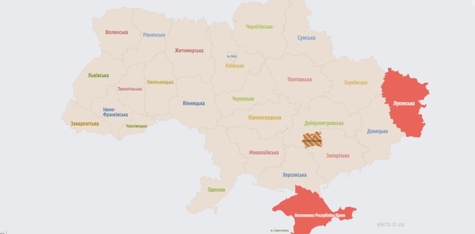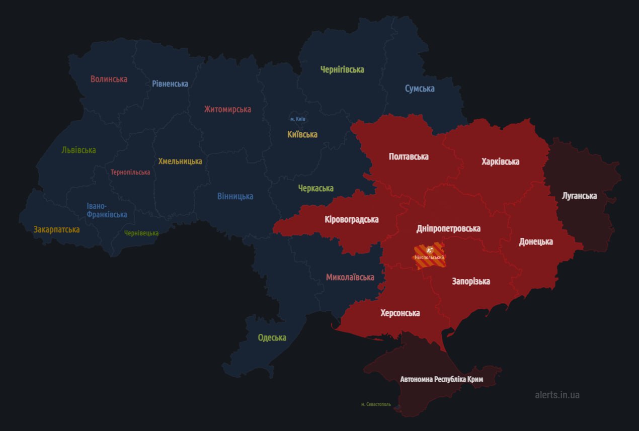 06.30 Карта тревог на сейчас. В Днепропетровской области угроза артобстрела.