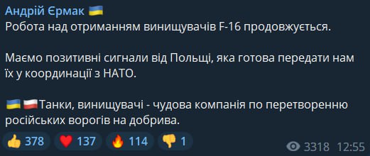 13.00 Глава Офиса президента Андрей Ермак сообщил о позитивных сигналах от Польши по поводу передачи Украине истребителей. По его словам, Варшава готова передать их Киеву в координации с НАТО.