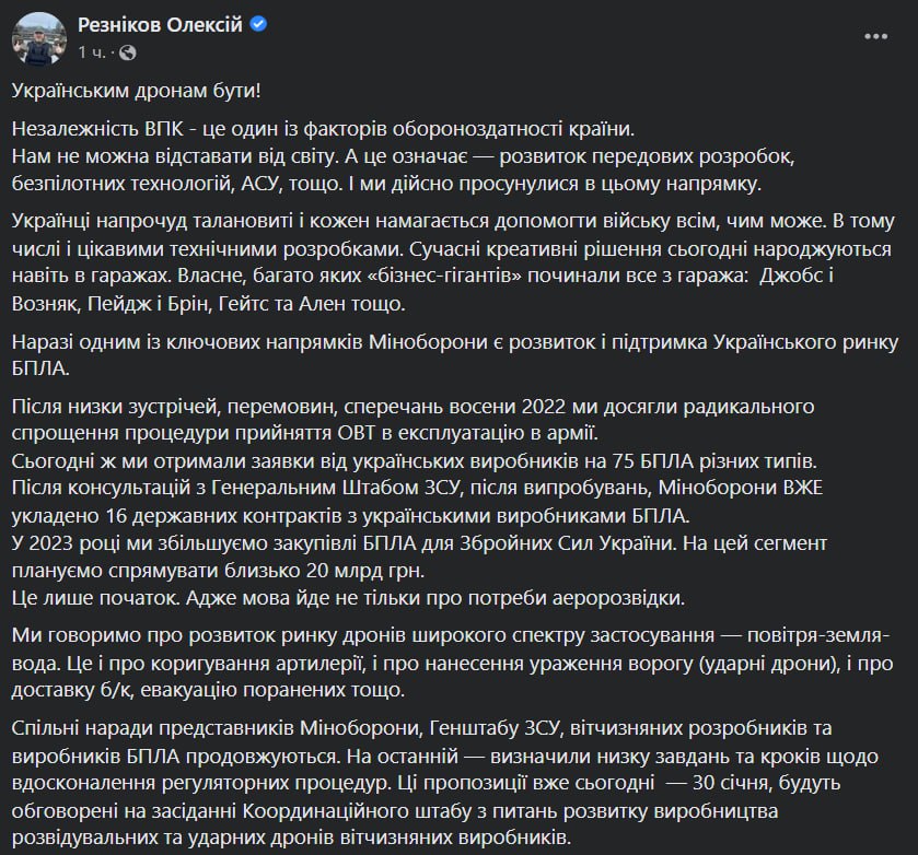 "В 2023 году мы увеличиваем закупки БПЛА для Вооруженных сил Украины. На этот сегмент планируем направить около 20 млрд. грн", - сообщил он.