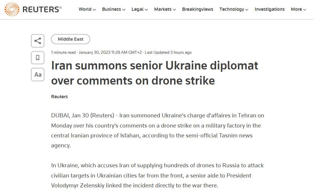 14:09 МИД Ирана вызвал временного поверенного в делах Украины в Тегеране из-за комментариев украинских официальных лиц касательно ударов БПЛА по иранским военным объектам, сообщает Reuters.