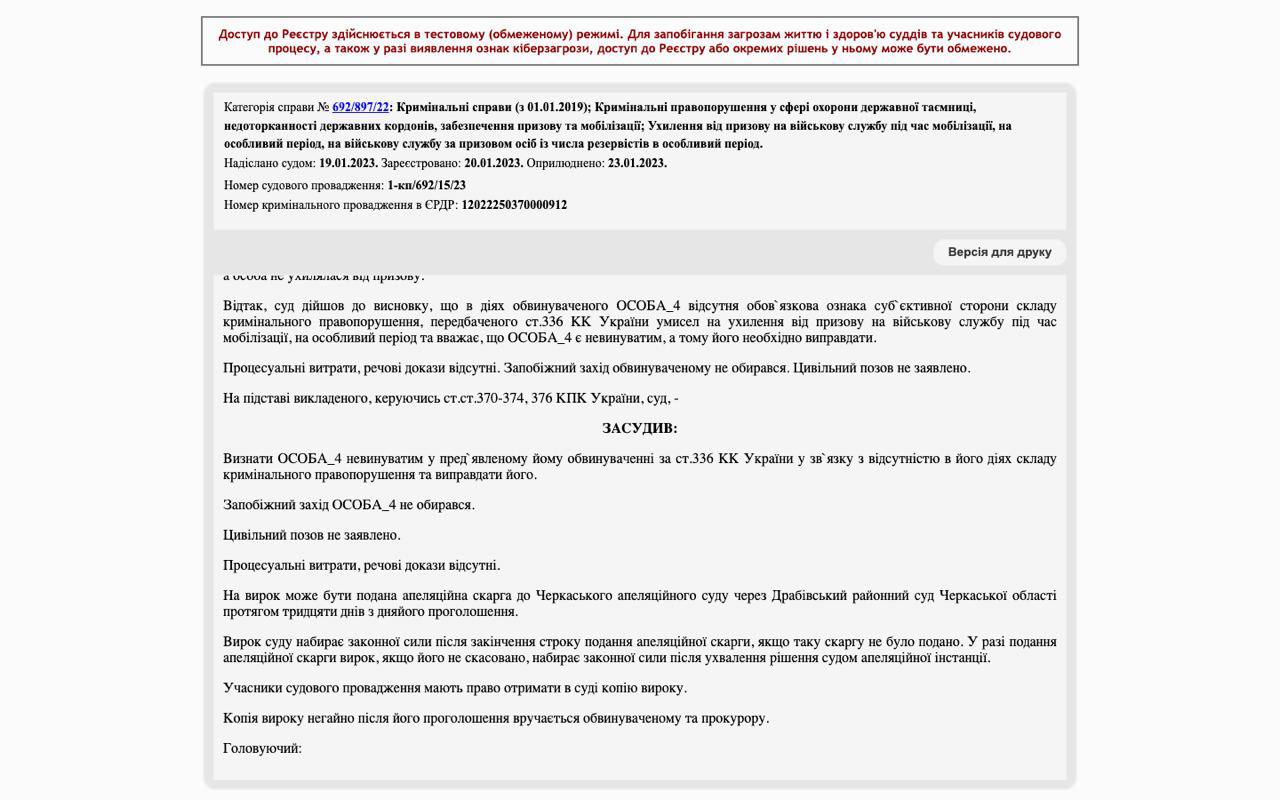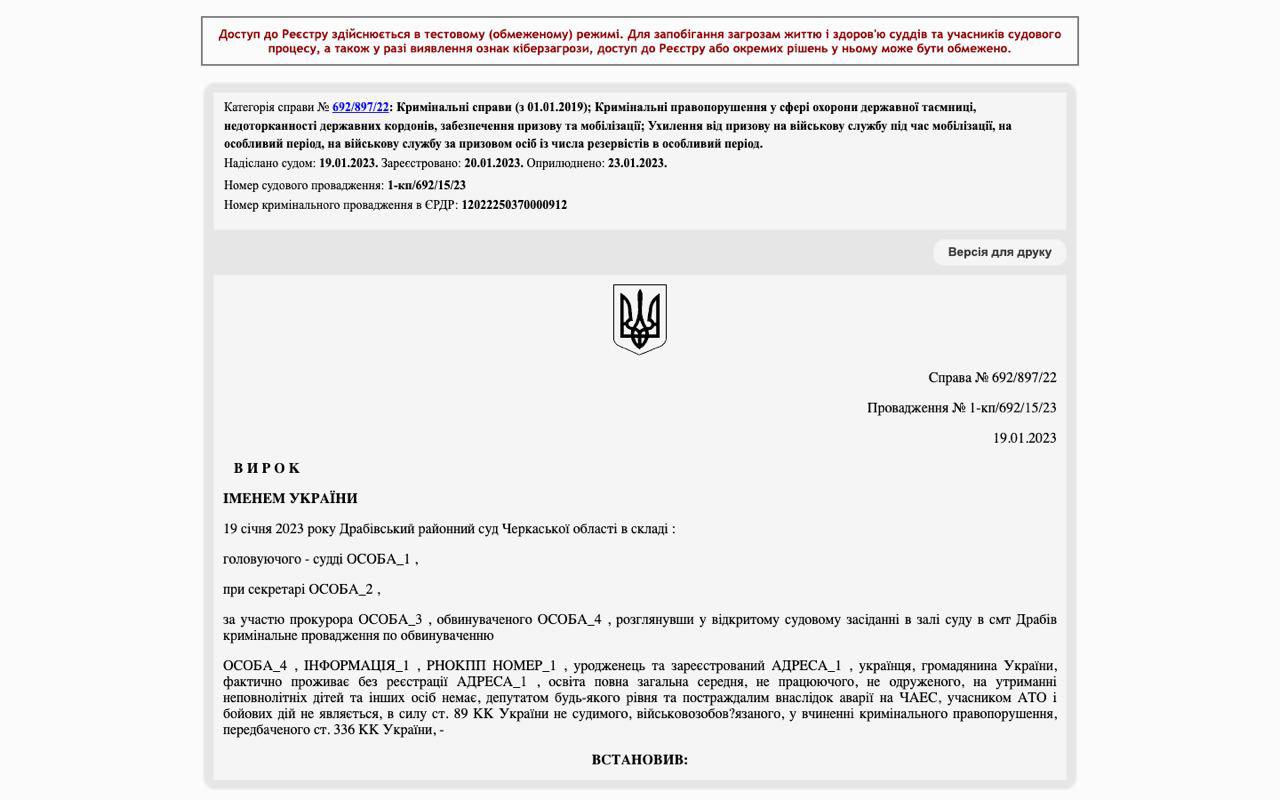 Он был признан виновным по ст.336 УК Украины (Уклонение от призыва на военную службу по мобилизации, на военную службу по призыву лиц из числа резервистов в особый период).