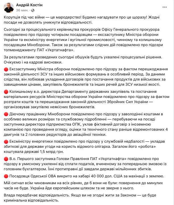 Генпрокурор Костин рассказал, какие подозрения сегодня были объявлены топ-чиновникам