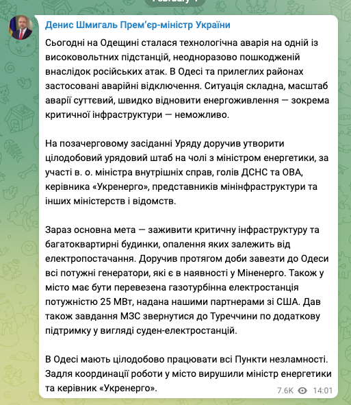 В обесточенную Одессу в течение суток завезут все мощные генераторы, которые есть в наличии в Минэнерго, а также газотурбинную электростанцию мощностью 25 МВт, предоставленную США.