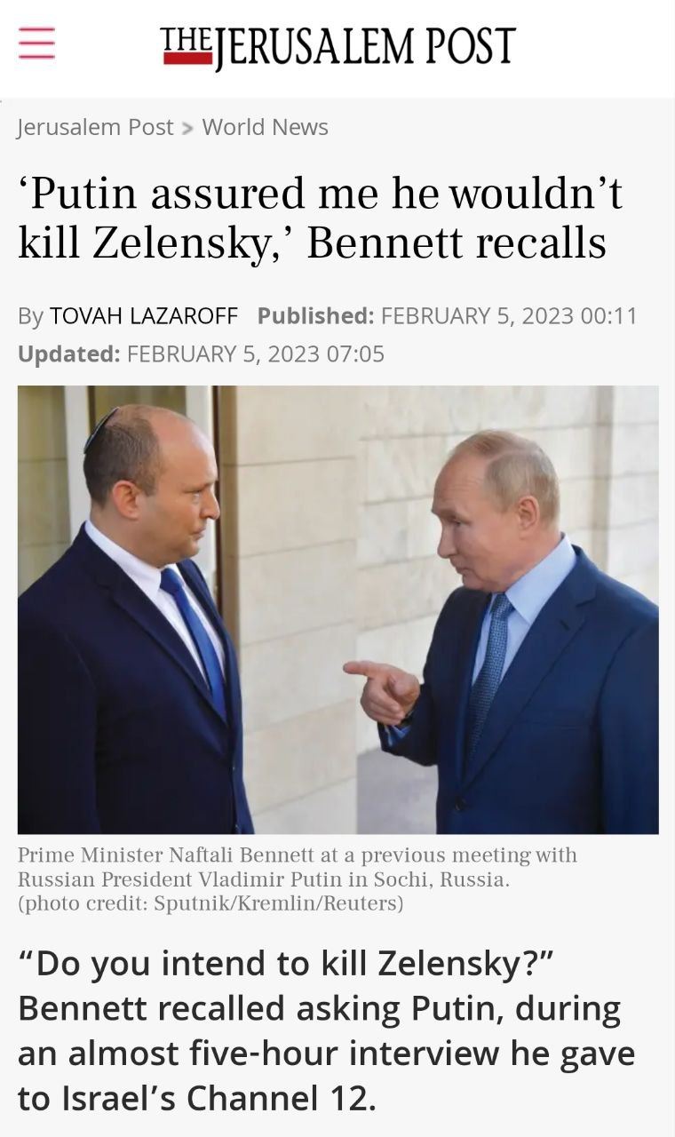 Президент РФ Владимир Путин пообещал не убивать президента Украины Владимира Зеленского на встрече с тогдашним премьер-министром Израиля Нафтали Беннетом, которая состоялась в первые дни войны. Путин заверил Беннета: "Я не собираюсь убивать Зеленского".