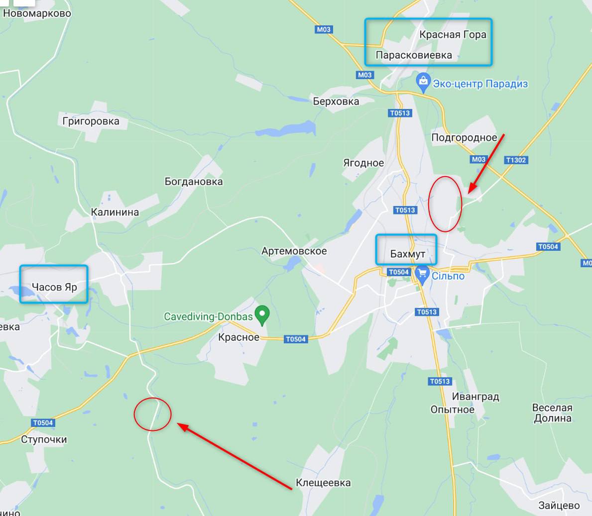 В целом район предполагаемых российских атак с разных сторон от Бахмута выглядит так:
