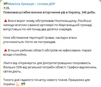 Также власти сообщают, что лимиты от Укрэнерго для Днепропетровщины покрывают около 53% от общей потребности области. Действуют графики отключений.