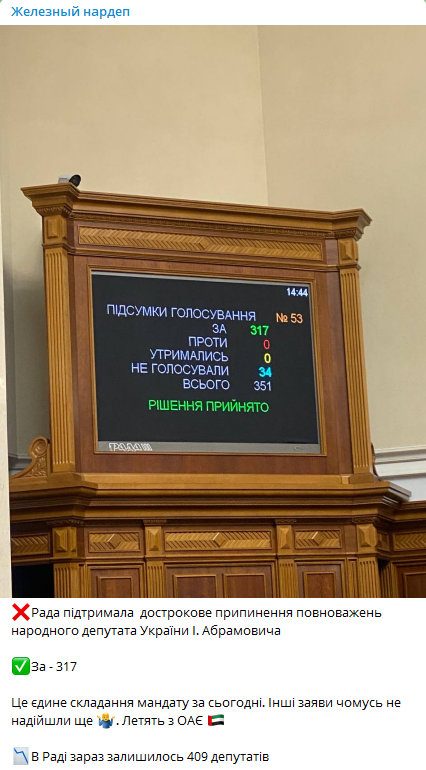 "Это единственное сложение мандата за сегодня. Другие заявления почему-то не пришли еще. Летят из ОАЭ", - прокомментировал голосование нардеп Ярослав Железняк в телеграм-канале.