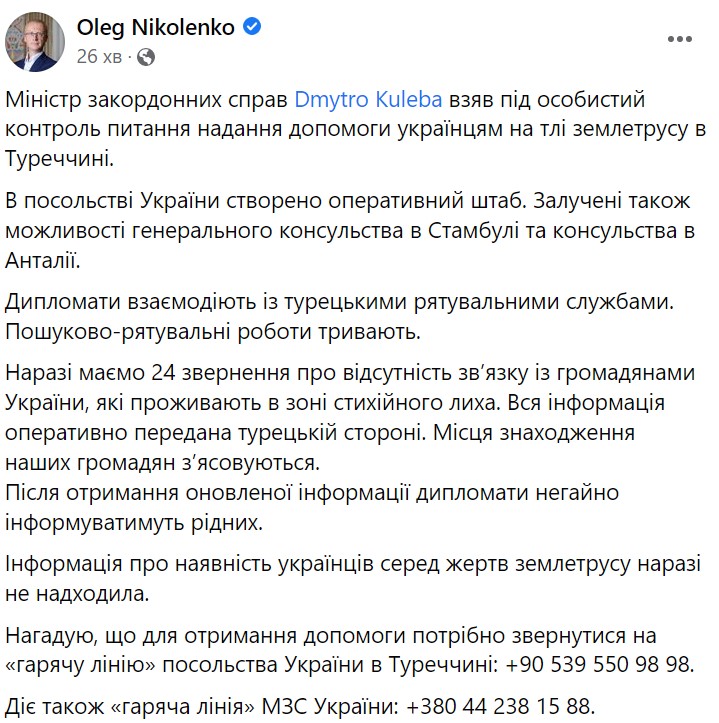 "Сейчас есть 24 обращения об отсутствии связи с гражданами Украины, проживающими в зоне стихийного бедствия. Вся информация оперативно передана турецкой стороне. Места нахождения наших граждан выясняются", - написал он.