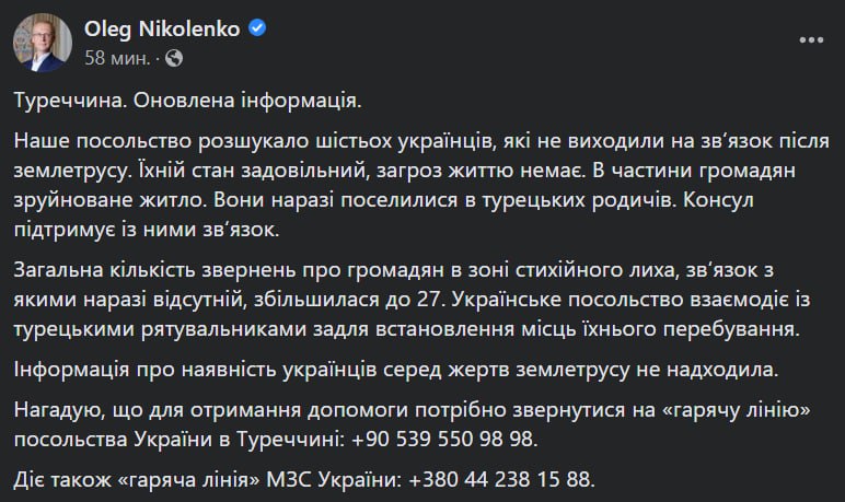 В зоне стихийного бедствия после землетрясения в Турции не выходят на связь 27 украинцев. Шестерых украинцев, которые не выходили на связь после землетрясения, удалось разыскать, их состояние удовлетворительное, угрозы жизни нет, у части разрушено жилье.