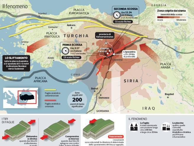 "Произошло горизонтальное скольжение Анатолийской плиты на юго-запад по отношению к плите Арабика. Это породило тип разлома, который сейсмологи называют "неглубоким поперечным потоком" с гипоцентром, то есть глубоким местом, где он выходит на глубину от 15 до 20 километров. Иными словами, Турция в оценках фактически отошла на пять-шесть метров от Сирии", - говорит ученый.