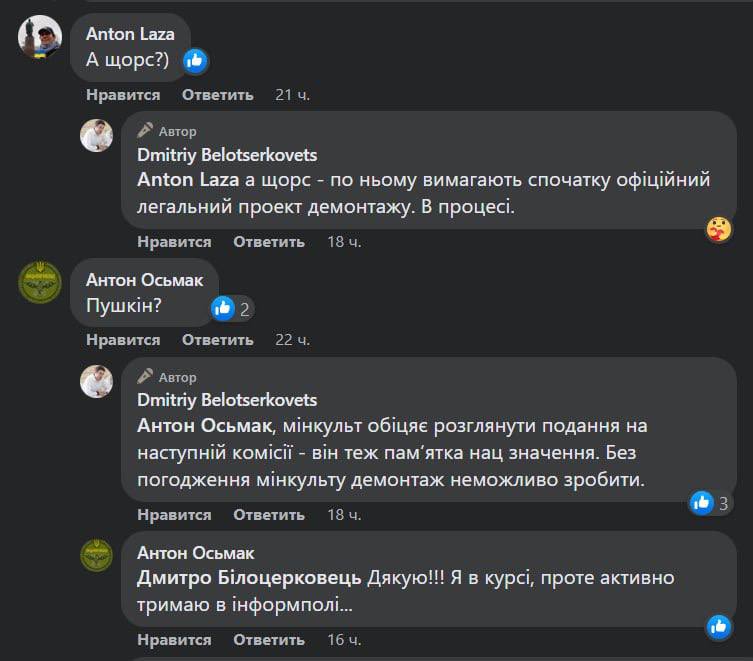 Он сообщил, что пока нерешенным остается вопрос демонтажа памятников Александру Пушкину и командиру Николаю Щорсу.