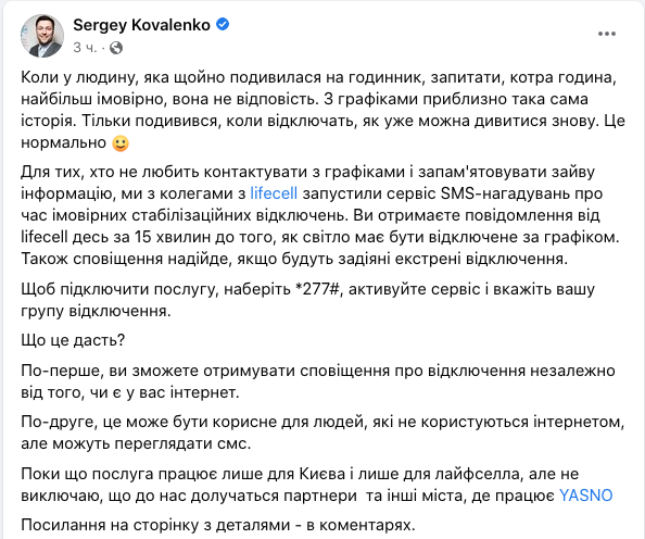 Об этом сообщает гендиректор компании "Yasno" Сергей Коваленко.