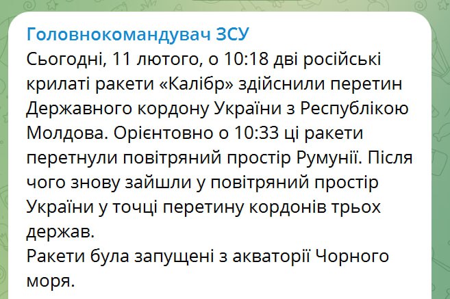 "В 10:18 две российские крылатые ракеты "Калибр" осуществили пересечение государственной границы Украины с Республикой Молдова. Ориентировочно в 10:33 эти ракеты пересекли воздушное пространство Румынии. После чего снова зашли в воздушное пространство Украины в точке пересечения границ трех государств", - написал главком ВСУ.