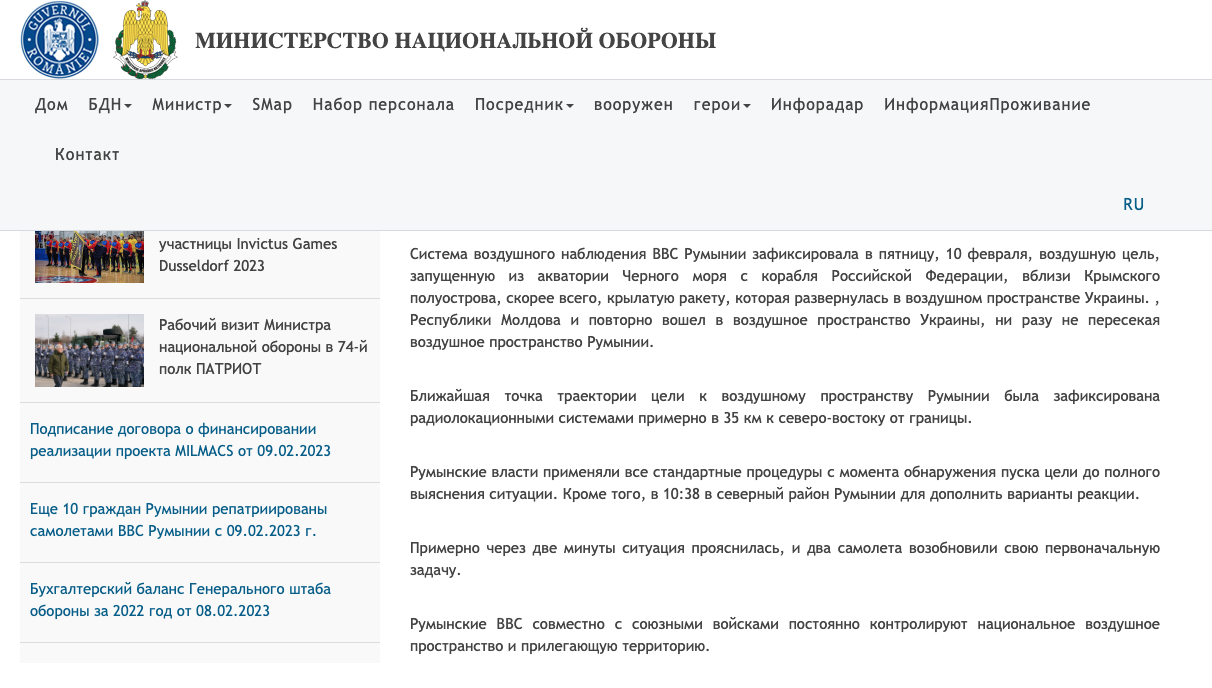 "Информация о пролетевшей над воздушным пространством Румынии российской ракете не подтверждается", - говорится в сообщении военного ведомства.