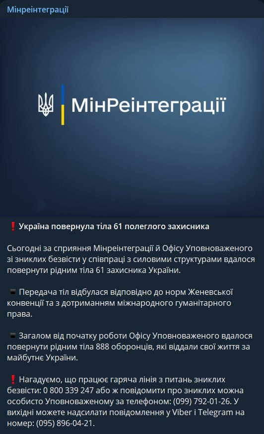 В Украину вернули тела 61 погибшего военного. Об этом сообщает Минреинтеграции.