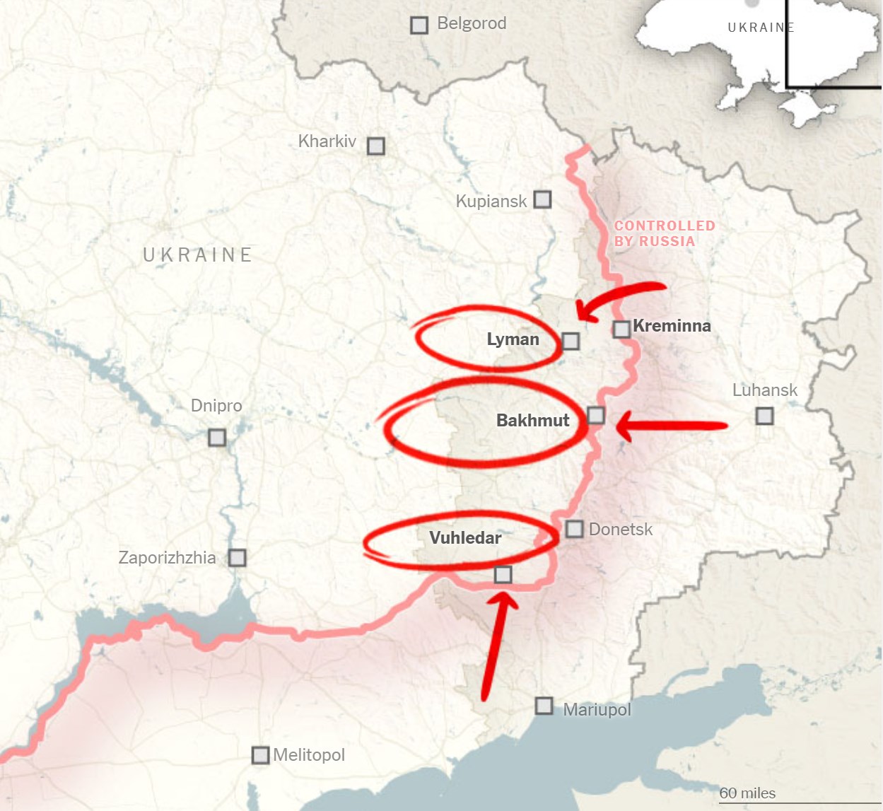 Россияне прежде всего будут наступать на востоке, где надеются одержать символическую победу, изгнав украинцев из Бахмута. Также они стремятся обезопасить линии снабжения, которые будут иметь решающее значение для любого их успеха в Украине.