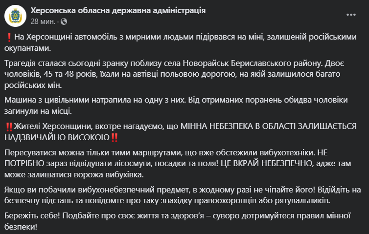 В Херсонской области на российской мине подорвался автомобиль. Погибли двое мужчин. Фото