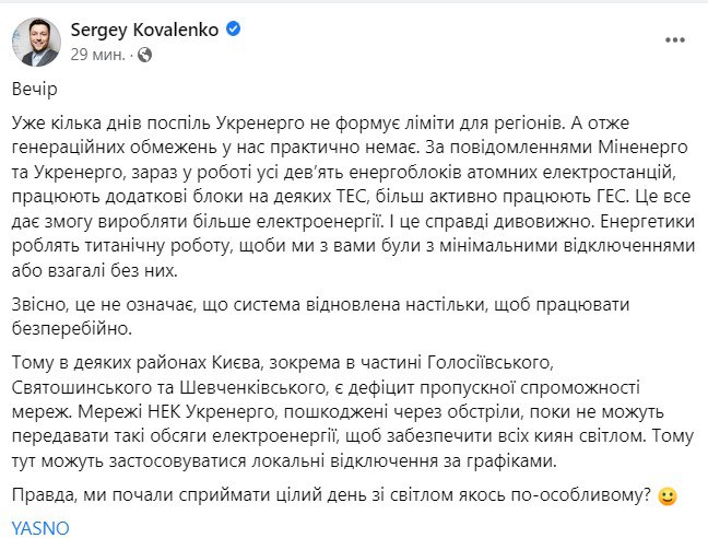 Об этом сообщил гендиректор Yasno Сергей Коваленко.