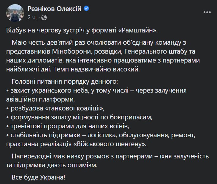 Министр обороны Алексей Резников отправился на девятую встречу на авиабазе Рамштайн. Предыдущая встреча была 20 января, следующая - завтра, 14 февраля.