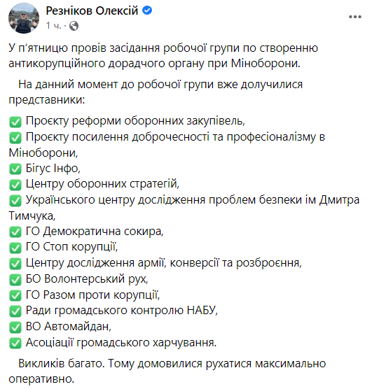 Министр обороны Украины Алексей Резников обнародовал список организаций, которые уже присоединились к рабочей группе по созданию антикоррупционного совещательного органа при Минобороны.
