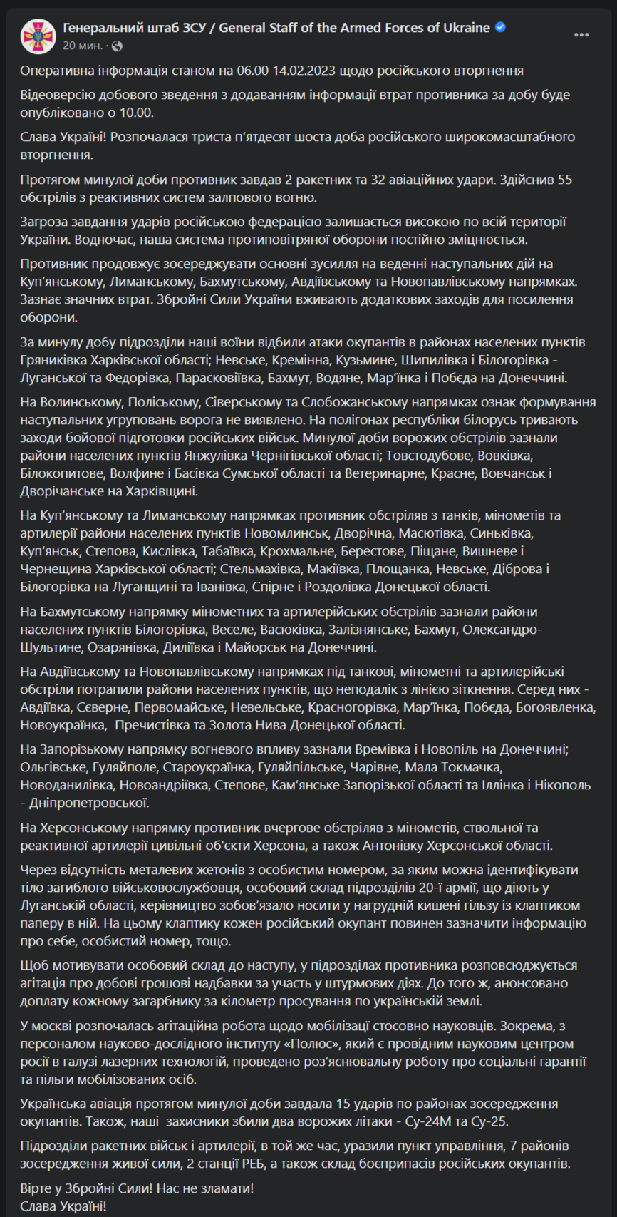 06:30 Сводка украинского Генштаба на утро 14 февраля. Главное:
