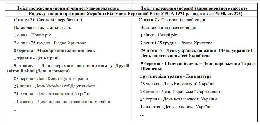 В этом проекте вместо 8 марта предлагается установить 25 февраля новый государственный праздник и официальный выходной - День украинской женщины. Дата выбрана в честь дня рождения Леси Украинки.