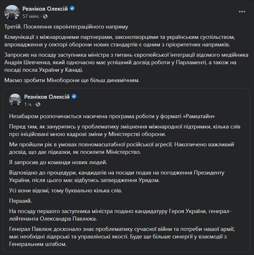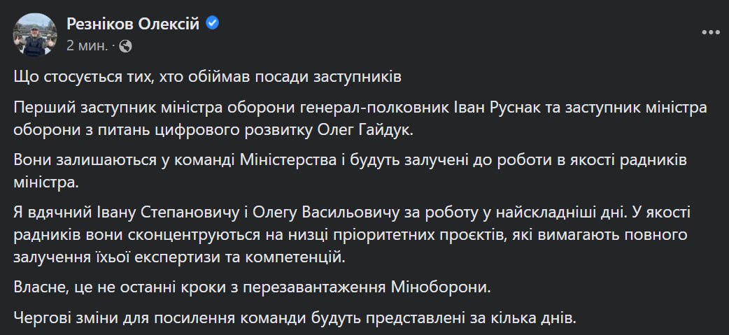 "Что касается тех, кто занимал должности заместителей. Первый заместитель министра обороны генерал-полковник Иван Руснак и заместитель министра обороны по цифровому развитию Олег Гайдук. Они остаются в команде Министерства и будут вовлечены в работу в качестве советников министра", - сообщил Резников в Facebook.