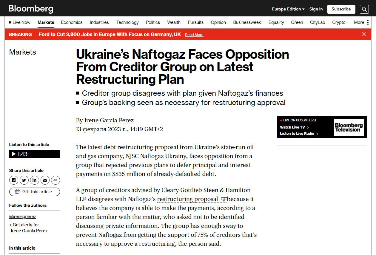 10:55 Группа кредиторов не желает давать отсрочку на долг "Нафтогаза" и отклонила предложение энергетической компании о реструктуризации, пишет Bloomberg.