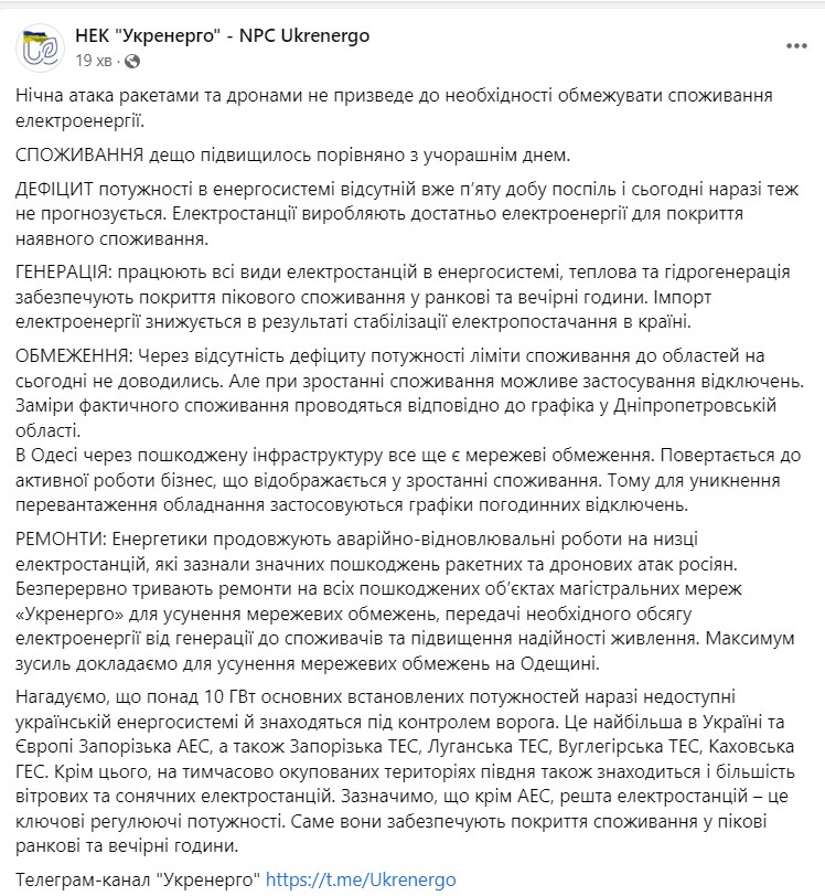 Ночная ракетная атака не вызвала необходимость ограничивать подачу электричества. Дефицита потребления электроэнергии в четверг, 16 февраля, в системе нет.