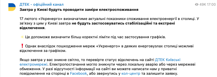 В Киеве завтра, 17 февраля, будут опять проводить замеры электропотребления, поэтому отключений света не будет - даже плановых.