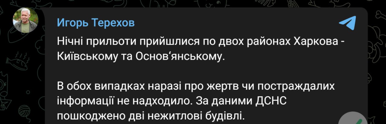 08.40 Ночные прилеты пришлись по двум районам Харькова – Киевскому и Основянскому, сообщил мэр Игорь Терехов.