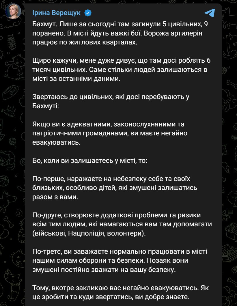 09.00 Вице-премьер Ирина Верещук призвала жителей Бахмута срочно его покинуть.
