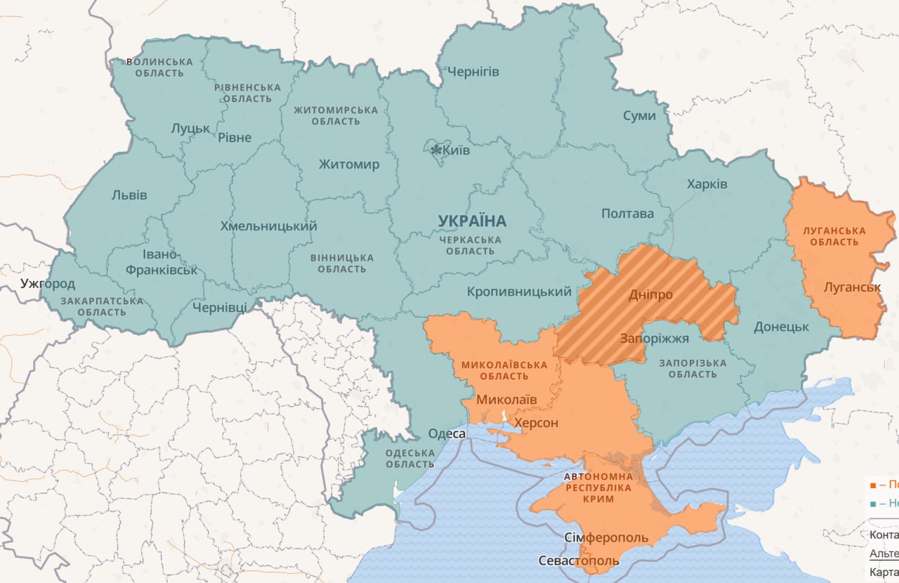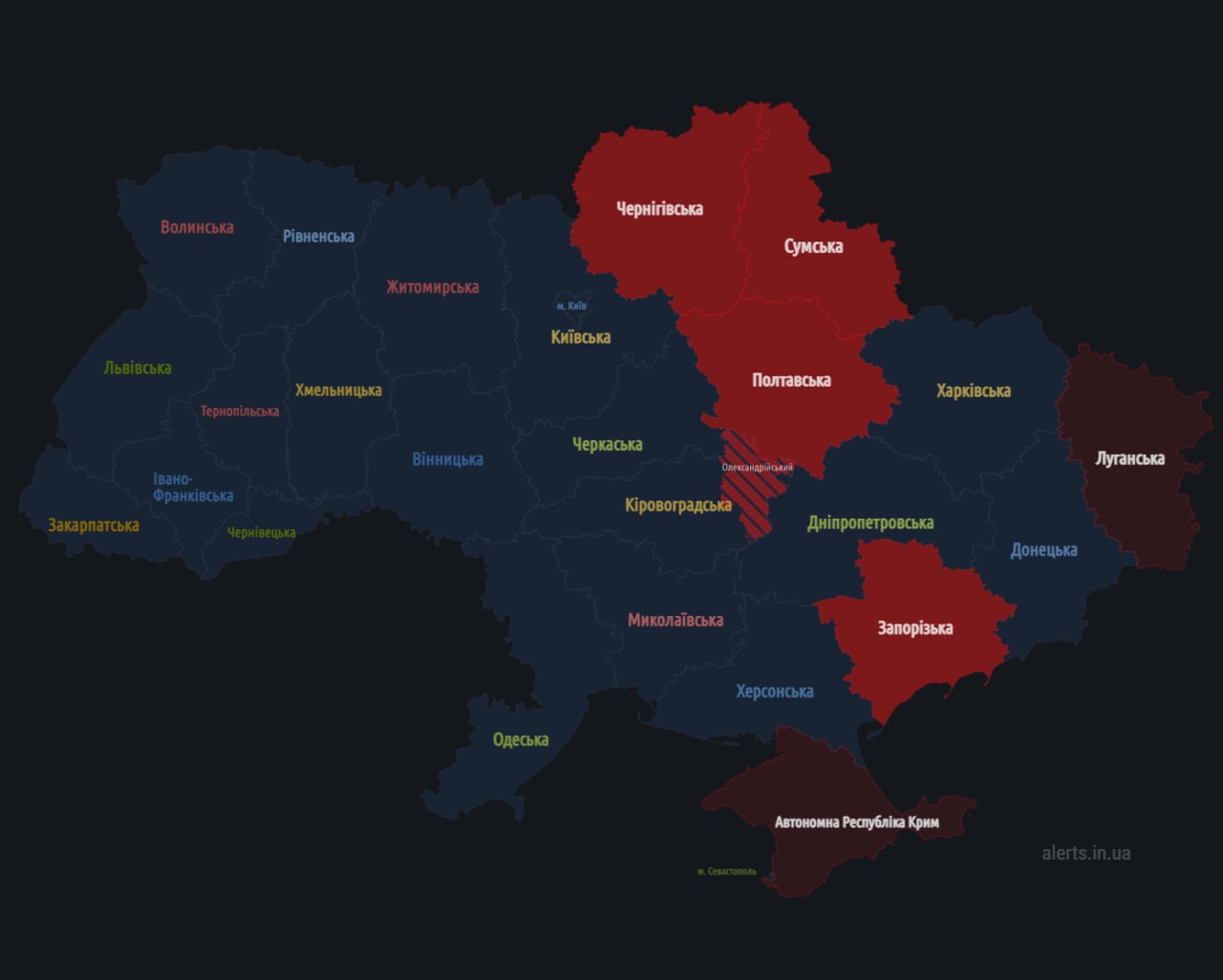 22:37 Воздушная тревога в Днепропетровской и Запорожской областях. Позже она объявлена также в Херсонской области.