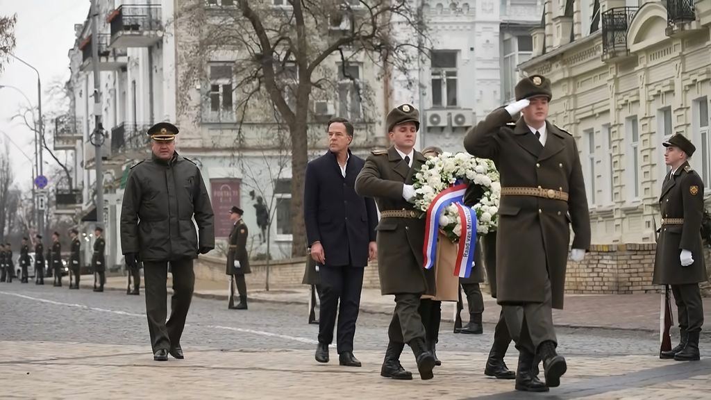 С утра Рютте возложил венок у Стены памяти, а дальше у них запланирована встреча с Зеленским и Шмыгалем, пишет голландская газета NOS.
